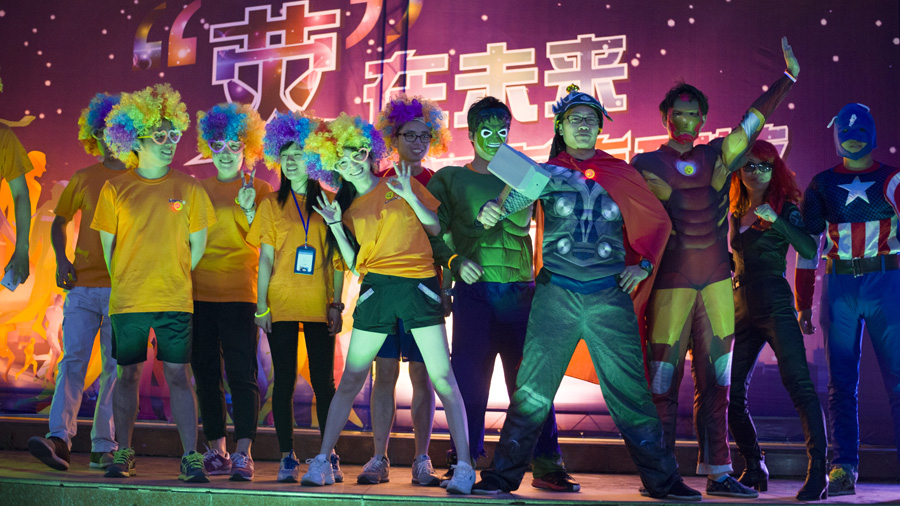在一曲《葫蘆娃》的音樂聲響起后,只見集團總部代表隊在超人與蛇精的帶領(lǐng)下,領(lǐng)著七個cos得惟妙惟肖的葫蘆娃,喊著“兄弟一家,活力迸發(fā)”的口號高調(diào)上場;尾隨其后的是法海許仙白娘子與小青帶領(lǐng)的星星家電代表隊,他們的口號是“千年等一回,法海也懂愛”;再是一群酷到流鼻血的、由鋼鐵俠、美國隊長、雷神、無敵浩克等組合而成的復(fù)仇者聯(lián)盟的閃亮入場,他們是喊著“讓我們一起拯救地光球”口號的水晶光電代表隊;最后上場的是星星瑞金科技代表隊,他們的西游取經(jīng)裝扮寓意星星科技公司一路降妖伏魔,歷經(jīng)九九八十一難,終將修成正果,他們的口號是“不畏艱險,一路向前”!
